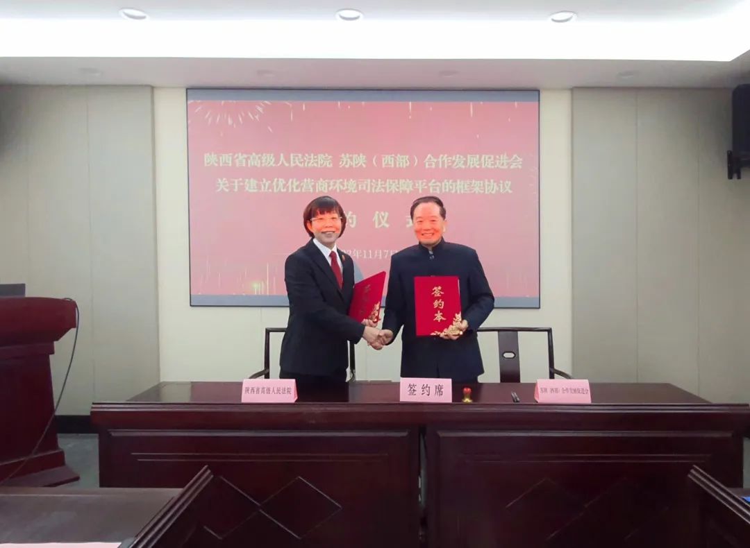 11月7日上午,陕西省高级人民法院与苏陕(西部)合作发展促进会举行座谈暨关于建立优化营商环境司法保障平台签约仪式活动。省高院党组成员、副院长焦玉珍,省高院民事审判第二庭庭长李晓峰一行5人出席会议。促进会党委书记、主席刘浩春,执行主席王占林,创会主席崔向阳、周其群、朱振清等企业家代表和有关同志10人出席会议。