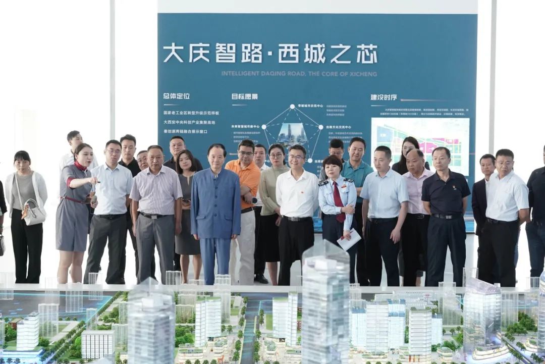 会前,在莲湖数字出海产业园相关负责人陪同下,与会人员参观了莲湖数字出海产业园时光长廊、规划馆、莲小驿、入驻企业办公区等区域,观看了莲湖数字出海产业园宣传片,通过数字实景沙盘,身临其境的了解了“大庆智路”区域规划布局和未来发挥发展蓝图。